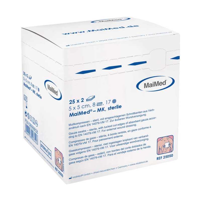 MaiMed® - MK, sterile is a ready-to-use 17-thread gauze compress made of 100 % cotton that complies with DIN EN 14079-VM17. Due to the folded cut edge (ES), the gauze swabs can be used without threads coming loose. MaiMed-MK sterile gauze swabs are characterised by their good absorbency and can be used in many clinical areas.